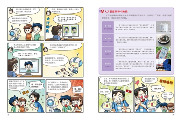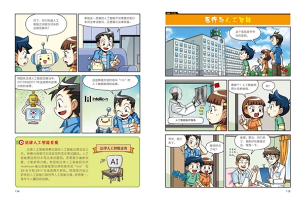 《大英儿童漫画百科》以大英百科全书公司出版的《大英百科全书》为基础,综合中小学阶段的教学内容,采用最新的图形和绘制技术精心打造,以孩子们的兴趣点为中心,集知识性、趣味性、实用性于一体,全方位满足青少年的知识需求。文稿讲述了极富挑战性的科学“人工智能”。故事刻画了三个角色鲜明的人物罗云、美琪和美琪的舅舅。美琪的舅舅,是一位在美国做人工智研究工作的博士。他带着美琪、罗云一起了解什么是人工智能和人工智能的历史,探讨各种领域的人工智能,如家里的人工智能音箱、智能房屋,保卫安全的人工智能无人驾驶汽车,金融领域的人工智能智能投顾等。他们还一起预测了人工智能的未来,如人工智能可以征服人类吗?第四次工业革命与职业的变化等。罗云和美琪在舅舅的引导下学习到了很多关于人工智能的知识,拓展了眼界。文稿知识齐全,有丰富的词条和高清的图片,帮助孩子更好的理解人工智能的魅力。行文条理明晰,漫画的形式活泼有趣,可以充分激发孩子的阅读兴趣,培养其探索精神。
