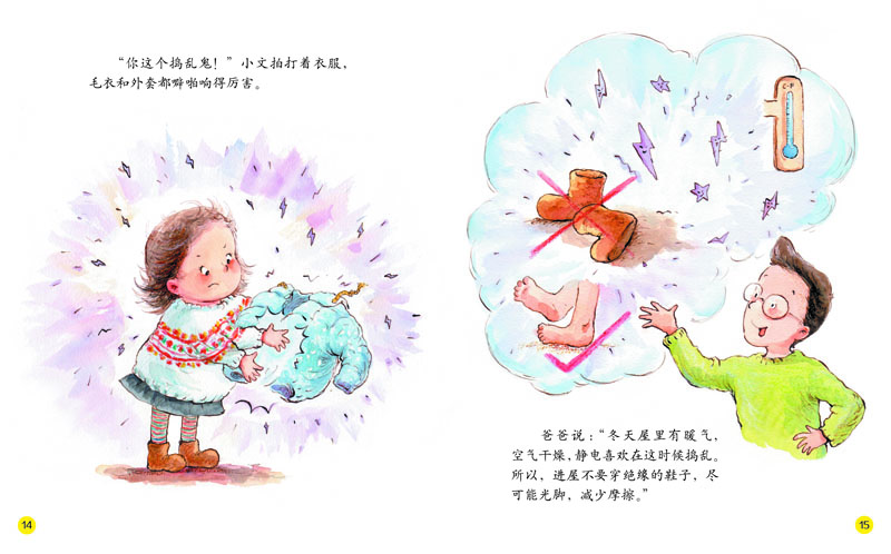 刚进屋的小文的头发都炸起来了,刚一摸门把手,就听见噼啪一声,原来,这是“捣乱鬼”静电在作怪呢。怎么样能让静电听话呢?看爸爸的好主意吧……