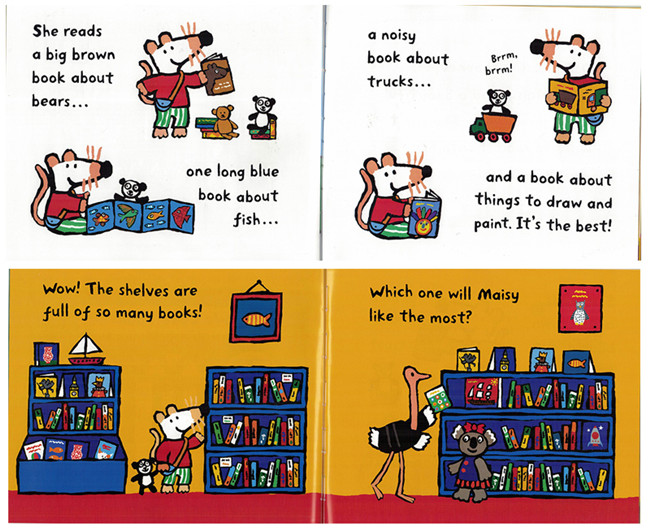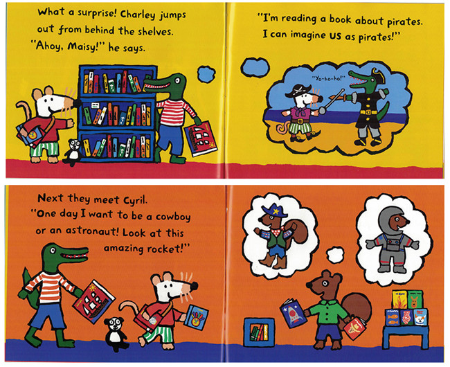 讲述了梅西第一次去书店的故事。梅西去书店买了一本新书,她还想买一本作为送给朋友塔露拉的礼物。书店的书架上摆满了令人惊奇的书!店主也很乐于助人。梅西发现她的朋友查理、西里尔和埃迪在里面。每个人都有这么多的乐趣选择他们喜欢的书和想象各种各样的野生和美妙的事情!他们一起分享故事,甚至在咖啡馆里吃美味的小吃。