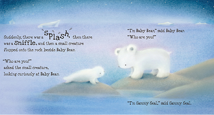 静谧的夜晚,一只熊宝宝徜徉在无边的夜色中.好奇驱使着它不断探索这个未知的世界.大大的脚印,圆圆的月亮,蔚蓝的海水.熊宝宝有些茫然……但随后他遇到了sammy seal.有了小伙伴的陪伴,熊宝宝便不再恐惧了。