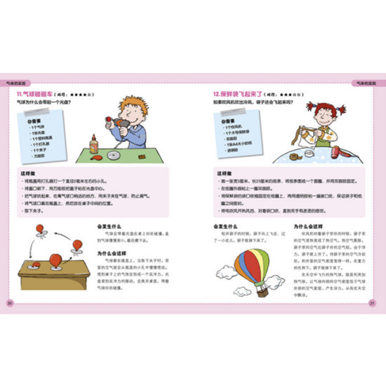 学科学,不做实验怎么行? 从孩子牙牙学语开始,他们就好像有问不完的问题,有些问题天马行空,有些问题不可思议。尤其是进入小学之后,他们问的问题越来越深奥:指南针为什么一直指向南北?为什么天空是蓝色的而不是其他颜色?声音为什么会让纸震动?氢气球怎么才能悬浮在空中不飘走?……当你正襟危坐地给孩子讲解这些抽象难懂的科学知识时,不过十分钟,他就跑得远远的。 学科学,不做实验怎么行? 对于儿童科普图书来讲,与纯粹的讲解科学知识相比,一个就地取材的简单实验,更能给小读者留下深刻的印象。这正是《101个神奇的实验》的宗旨:一套书全面培养孩子学习、理解、动手、探索、想象、合作六大能力,用实验的方式讲科普,用10分钟动动手,拨开知识的迷雾,用10分钟了解实验“为什么会这样”,让孩子“知其然更知其所以然”。 怎么才能知道风从哪里吹来? 苹果切开后怎么才能让它不变黑? 为什么感冒鼻塞后,吃什么都没味道? 为什么飞机不会从天空掉下来? 为什么行驶中的公交车突然刹车时,我们的身体会向前倾? 鸡蛋在盐水中为什么不会沉下去吗?