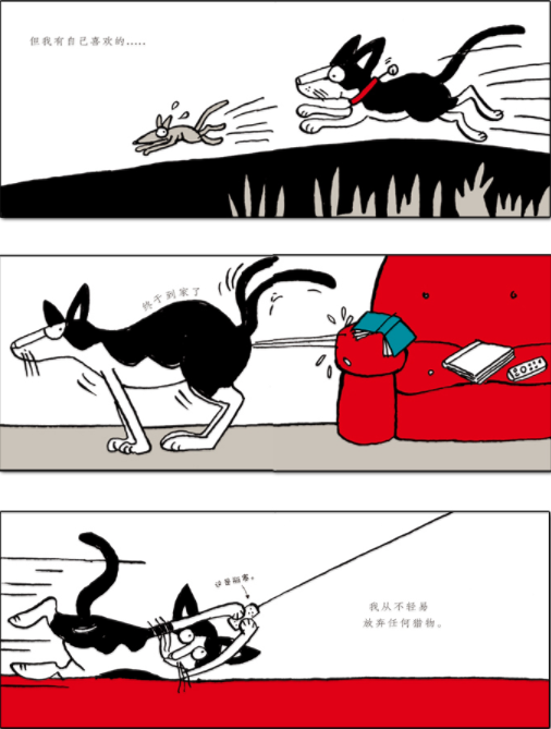 “我的生活很忙碌。”米尔顿懒洋洋地躺在椅子上说。“我什么也不怕。”它说,但是图中的它却被一只小鸟吓到了。这是多么的有趣,多么的有反讽意味啊!这种叙述方式被海黛阿德兰发挥得淋漓尽致。运用极少的元素,她创造了各年龄段都看得懂的丰富的内容。