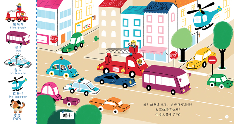 和小狗皮皮一起出发去度假吧!穿过城市,奔驰在高速路,到达大海边!你在一路上看到了哪些交通工具?你知道它们的中英文名字吗?试着在图中找到它们吧!交通工具可真是五花八门啊!你在生活中见过它们吗?
