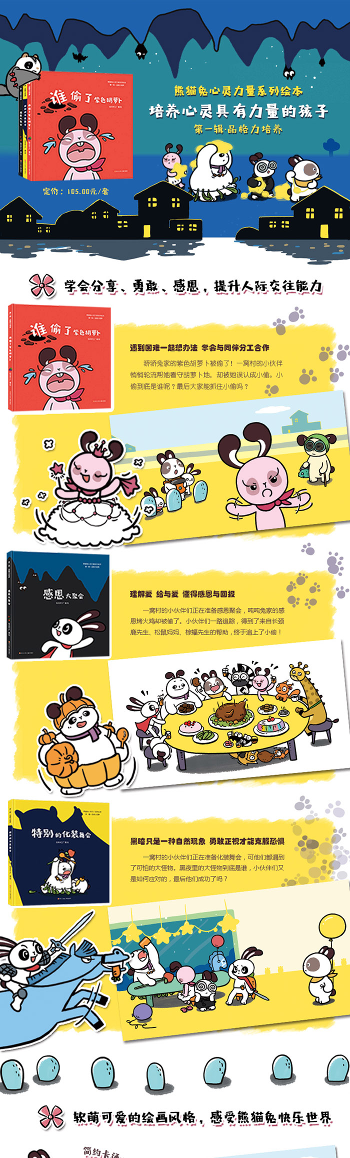 本套书以《3~6岁儿童学习与发展指南》为指导,旨在守护孩子心灵的纯真,积蓄孩子心灵的力量,激发孩子心灵的潜能,提升孩子的品格力、习惯力、情绪力和自我保护能力,让孩子在充满爱的环境中自主成长为一个内心丰富的人。《谁偷了紫色胡萝卜》讲述了分享的故事:骄骄兔家的紫色胡萝卜被偷了!一窝村的小伙伴悄悄轮流帮她看守胡萝卜地,却被她误认为小偷。小偷到底是谁呢?最后大家能抓住小偷吗?