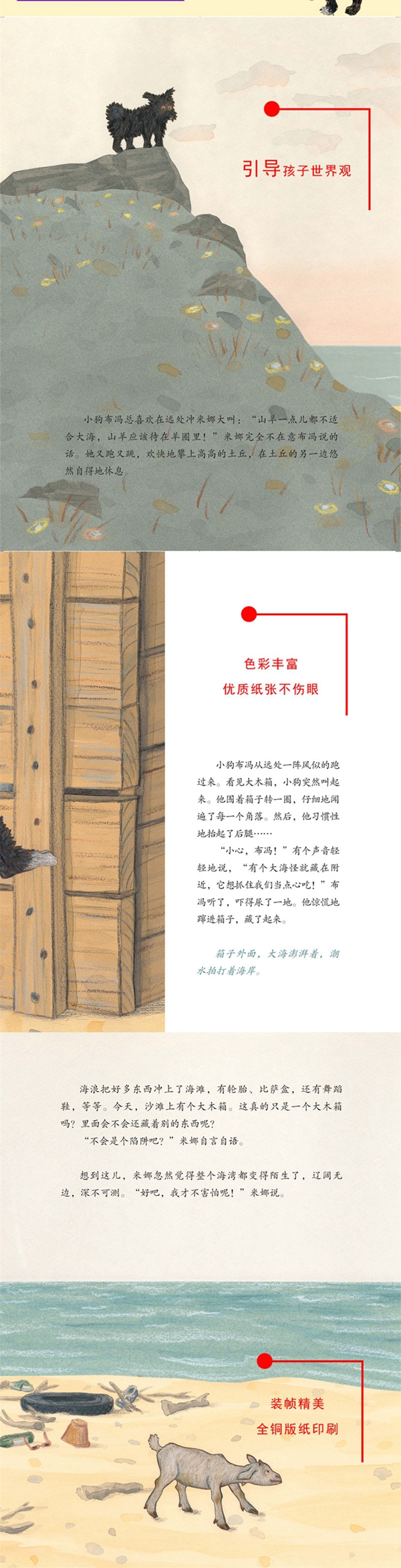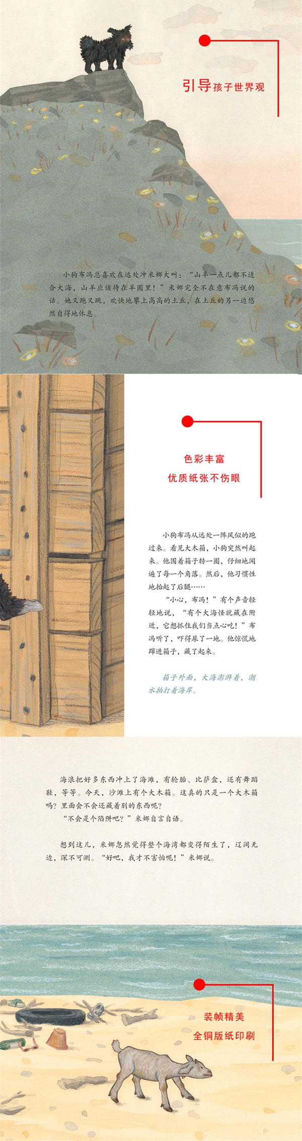 一天清晨,海滩上冒出了一只奇怪的木箱。小山羊米娜很好奇:箱子里面装的是什么?可是,这时她突然听到沉沉的脚步声由远及近。是海怪吗?还是赶紧躲到箱子里安全!米娜有点害怕,可她又想知道是谁在箱子外面呢?四个糊涂的、傻里傻气的小伙伴之间发生了一段有关害怕、猜测和勇气的诙谐故事。
