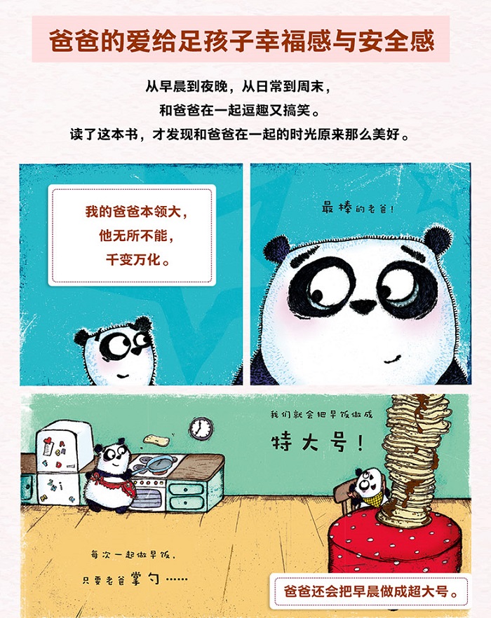 《我的超级老爸》是一封孩子对爸爸的告白情书。熊猫宝宝每天和爸爸相处的欢乐时光,每天吃到爸爸做的超大号早餐,每天想念的时候给爸爸打一通电话,每天临睡前爸爸他讲睡前故事,在熊猫宝宝眼里爸爸无所不能,时而搞笑,时而严肃,爸爸每天的陪伴成为他心中非常期待的事情,爸爸就是他心目中的超级英雄。