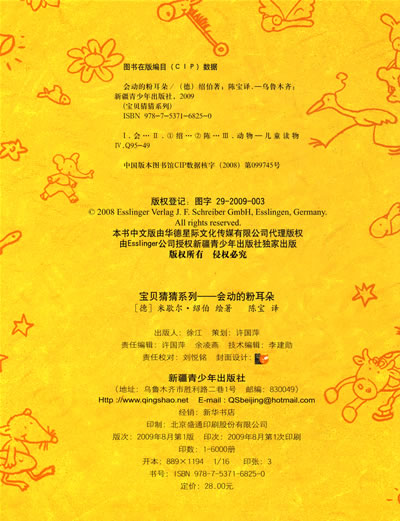 《会动的粉耳朵》内容简介:我的宝贝有一对会动的粉耳朵,脖子后面的鬃毛剪得短短,还有一条能卷成圆圈圈的小尾巴和一个滾圆滾圆的粉红肚子。喂,这会是谁呢?你知道吗?它就是……你能猜出来吗?这个神秘宝宝就藏在折页里,不信你就翻开来试试看——不仅能左右翻,还可以上下翻呢。