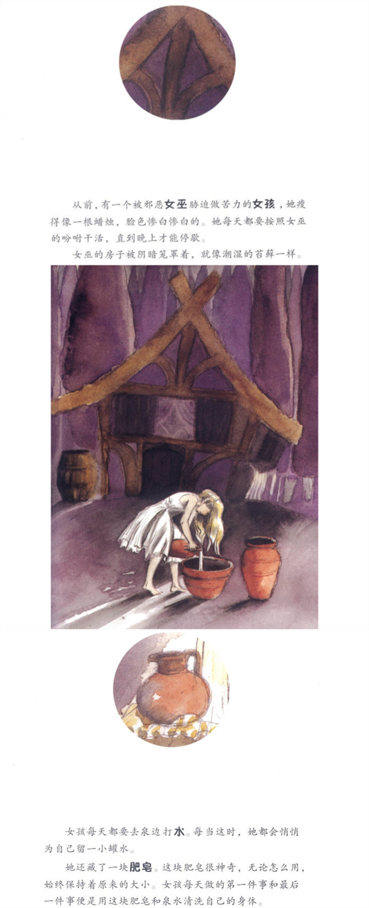一个贫穷的女孩每天为邪恶的女巫工作,可是无论多辛苦,女孩每天晚上都会用水擦洗自己的身体,也因为这样,邪恶的女巫一直没有把邪恶传给女孩。女巫为了让女孩变得像自己一样,不给女孩水,不给女孩牛奶······可是,月光照在女孩身上,女孩用月光洗净了全身,并且将女巫也变成善良的人。她和女巫一起,走遍世界,传递善良。