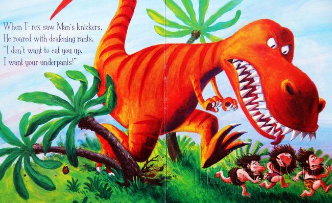 原始人是最早开始发现不应该裸体的,所以发明了内裤,这件事被暴龙发现了,于是威胁原始人交出内裤来,它们也要穿内裤!但是没想到暴龙不但穿不上裤子、还因此跌倒;剑龙对内裤的材质过敏;腕龙的内裤太小、三角龙和刺盾角龙也加入争夺内裤的混战之中…最后恐龙们因为“内裤”而大打出手,最后就全部灭绝了,原始人才得已顺利生存下来,变成现代的我们。