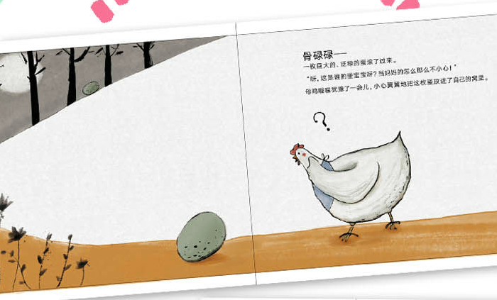 母鸡喔喔捡到一枚蛋,一枚不一样的、丑丑的、奇怪的蛋。大家都不喜欢它,劝喔喔把它丢掉。丢?不丢?喔喔会做出什么样地选择呢?