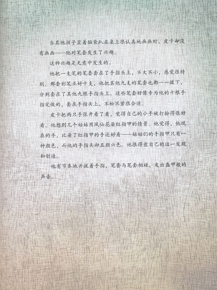 曹文轩所*的《瞧瞧我的花指头(精)/童年中国原创图画书系列》讲述了小男孩皮卡在油麻地度过的一段有趣的时光。皮卡把彩色笔套戴在手指头上,五颜六色真好看!于是他舍不得摘下这十根“花指头” ,吃饭睡觉都要戴着,走到哪里都要戴着,结果,皮卡看到了一只蜻蜓,,伸出“花指头”一捏,蜻蜓明明已经捉住了,怎么又从指间飞跑了呢?