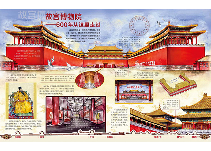 故宫博物院是一座特殊的博物馆,它建立在明清两朝皇宫的基础上,精心保管着980余座古建筑与186万余件珍贵文物。本书以午门为起点,沿故宫中轴线对太和殿、乾清宫、养心殿等古建筑及历史原状陈设进行深入讲解,并从书画、陶瓷、武备、钟表、珍宝各馆的展品中精选百余件珍贵文物,其中不乏《千里江山图》、各种釉彩大瓶、铜镀金写字人钟、桐荫仕女玉山等镇院之宝。在介绍历史建筑与文物的同时,向读者展示它们背后的非遗技艺,帮助孩子认识故宫,亲近传统文化。