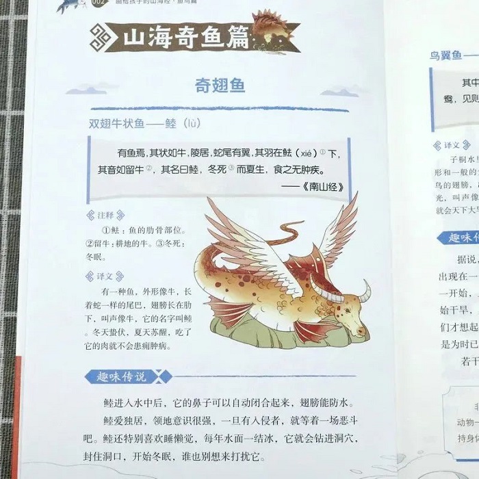 《山海经》是我国的一部奇书,其中描绘的奇幻人神、异兽、鱼鸟等形象,早已成为了后世文学艺术创作的创意源泉。本书在忠于原著的基础上,将书中的英雄人物、各路神仙、奇兽异鸟等,进行分类编排整理,更加适合孩子阅读和理解。通过阅读本书,孩子对我国的上古神话和民间传说,有了更深入的了解。此外还有相关的趣味传说,进一步拓展了神话内涵。在丰富孩子想象力的同时,本书旁征博引,加入上古文化、传统风俗、趣味科普等拓展内容,蕴含丰富,讲解通俗易懂,且配有全彩插图,带给孩子美好的阅读享受。本书主要分为“山海奇鱼”和“山海奇鸟”两大板块,并在此基础再进行细分为奇翅鱼、奇足鱼、五采鸟、奇能异鸟等,帮助孩子更好地了解山海中的奇鱼怪鸟。
