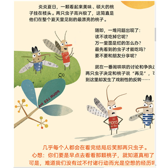 包揽7国大奖的澳大利亚重量级作家格斯?戈登经典绘本,启发孩子思考:我们看到的,就是真的吗?炎炎夏日,一颗看起来美味、硕大的桃子挂在枝头。两只虫子高兴极了,这简直是他们在整个夏天里见到的很漂亮的桃子。随即,一堆问题出现了:该不该吃掉它呢?万一里面是烂的怎么办?优选看到的虫子才能吃吗?要不要和朋友分享呢?就在一番闹哄哄的讨论和争执过后,两只虫子决定和桃子说“再见”,可故事到这里却发生了戏剧性的反转……