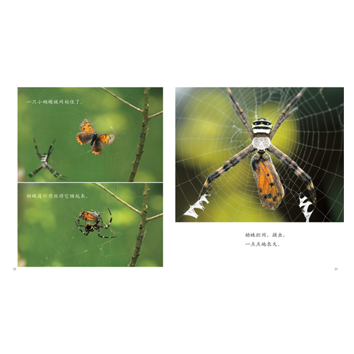 一提到“织网能手”,大家马上就能反应过来,没错,我们这里要介绍的就是蜘蛛。相比平时见到的黑乎乎的丑陋可怕的蜘蛛,绘本里的蜘蛛却是很美丽的,它还有一个明媚的名字“悦目金蛛”。你是不是很想知道蛛丝为什么黏糊糊的,蜘蛛为什么不会被蛛网粘住呢?那就来看看蜘蛛的生活吧!