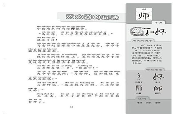 本书是《周大侠趣说字源阶梯阅读第1级》这套丛书中的一本,选取小学1年级语文教材下册的生字,故事选取《大个子老鼠小个子猫》《希尔的故事》等几十篇童话。每页有文中生字的字源解释。作品主题积极向上,想象丰富,贴近儿童,古今结合,既用字源讲解帮助学生从形义等方面识字,又通过字源的梳理弘扬了传统文化,是文学和传统文化的有机结合。
