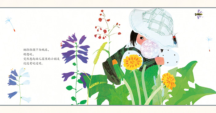 《蒲公英》这是一个关于分享的小故事。小斌找到一朵美丽的蒲公英绒球,小心翼翼带到幼儿园里,与也想吹绒球的小朋友一起,吹出了美丽漫天的蒲公英种子。寓意在于分享不仅能让分享者感受到快乐,更能感染更多的人。画家王福民老师绘制出的唯美和纯净,为这个故事添加了光彩。