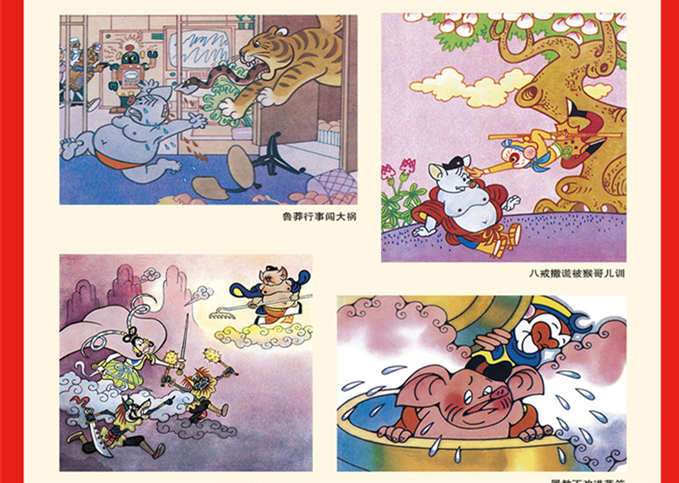 "画家在传统写实的基础上吸收了国外风格,形成了自己独特的艺术形式。在造型上运用夸张变形的手法,生动形象地刻画了八戒等形象,使故事中的人物特征鲜明、典型且富有情感。画面时而氛围幽默愉悦,时而富有动感;细节丰富且极具可看性,加强了故事的叙事性和传情的效果,使读者欣赏画面的同时不知不觉地坠入故事的情节之中。