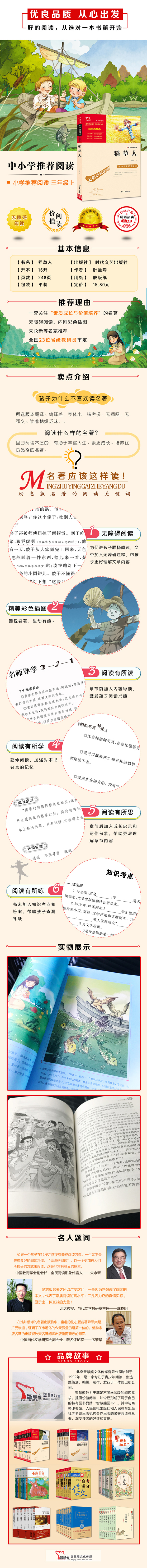 《稻草人》是叶圣陶在1922年完成的一篇童话,刊登在1923年第五卷期的《儿童世界》杂志上。之后,他将自己在1921年至1922年上半年创作的二十三篇童话结集出版,以后一篇《稻草人》的篇名作为全集的名称。这部童话集中,部分作品为儿童描绘了一片充满想象的“天真的乐园”,但更多的作品严肃地反映了现实社会。本书秉持精选叶圣陶童话精品的原则,选入他的二十八篇童话结集为《稻草人》,与初版《稻草人》的选篇有所不同,希望能更全面地展现叶圣陶的童话创作风格。