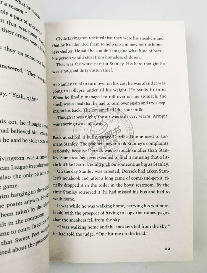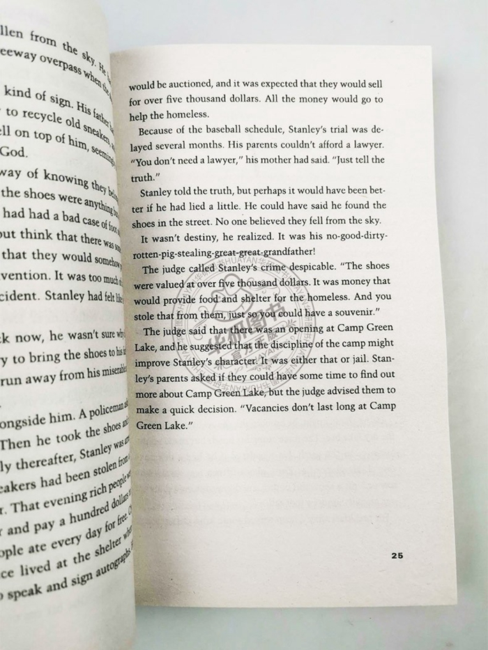 There is no lake at Camp Green Lake. There once was a very large lake here, the largest lake in Texas. That was over a hundred years ago. Now it is just a dry, flat wasteland. There used to be a town of Green Lake as well. The town shriveled and dried up along with the lake, and the people who lived there. During the summer the daytime temperature hovers around ninety-five degrees in the shade—if you can find any shade. There’s not much shade in a big dry lake. The only trees are two old oaks on the eastern edge of the “lake.” A hammock is stretched between the two trees, and a log cabin stands behind that. The campers are forbidden to lie in the hammock. It belongs to the Warden. The Warden owns the shade. Out on the lake, rattlesnakes and scorpions find shade under rocks and in the holes dug by the campers. Here’s a good rule to remember about rattlesnakes and scorpions: If you don’t bother them, they won’t bother you. Usually. Being bitten by a scorpion or even a rattlesnake is not the worst thing that can happen to you. You won’t die. Usually. Sometimes a camper will try to be bitten by a scorpion, or even a small rattlesnake. Then he will get to spend a day or two recovering in his tent, instead of having to dig a hole out on the lake. But you don’t want to be bitten by a yellow-spotted lizard. That’s the worst thing that can happen to you. You will die a slow and painful death. Always. If you get bitten by a yellow-spotted lizard, you might as well go into the shade of the oak trees and lie in the hammock. There is nothing anyone can do to you anymore.