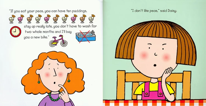 Daisy不喜欢吃豆子,不管妈妈说多少“甜言蜜语”:如果Daisy吃掉豆子,她可以有额外的布丁,一间巧克力工厂或者是火箭,可是,还是打动不了Daisy。思维敏捷的Daisy能抵挡得了妈妈的利诱吗?