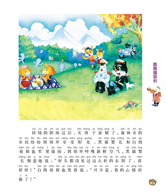 持续的阴雨过后,天终于放晴了。森林市的市民纷纷到郊外享受阳光,黑猫警长和白鸽侦探也忙里偷闲,到郊外呼吸新鲜空气。黑猫警长惬意地说:“好久都没见过这么好的太阳了,真舒坦!”白鸽侦探也笑着说:“可不是,我的心情好极了!”
