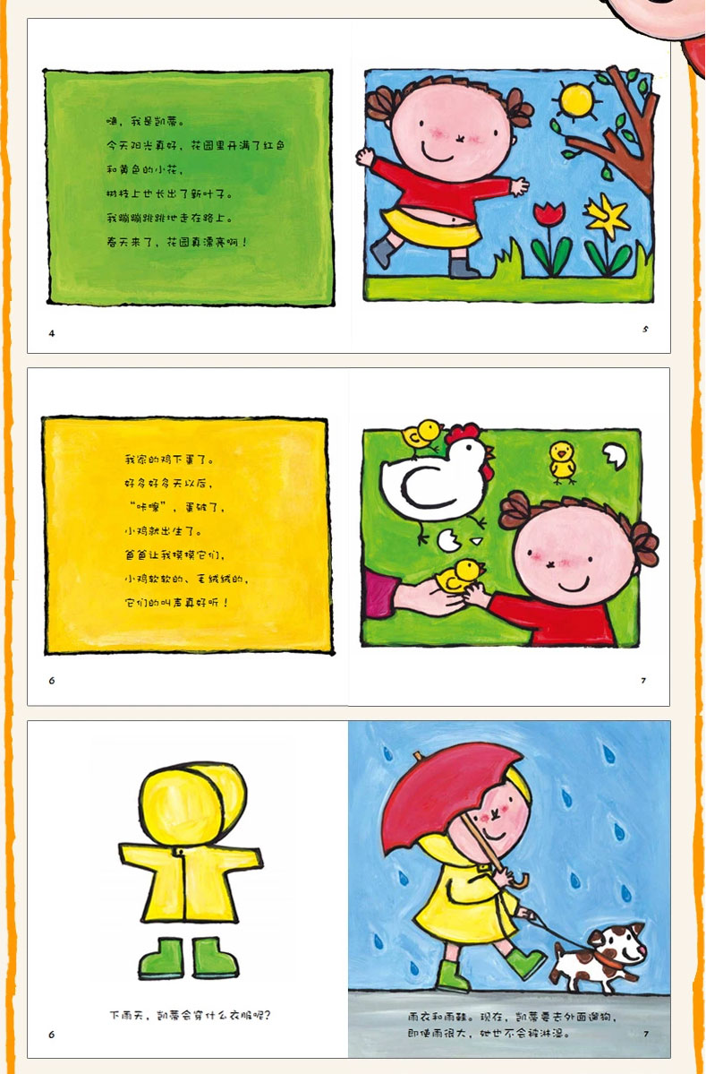 该书的画面颇具特色。作者始终把视线定位在孩子,从孩子的视角去观察。所以,以居于画面中心位置的都是主人公凯文或凯蒂,而且几乎都是正脸对着小读者,很少有侧面,这符合低幼儿童的欣赏习惯。该书的画面简洁,与文字形成很好的互补关系。两位主人公的造型可爱,随时挂在脸上的微笑,带给孩子正向的“安全感”。语言更是简单活泼,富有节奏感,幼儿完全能听懂。
