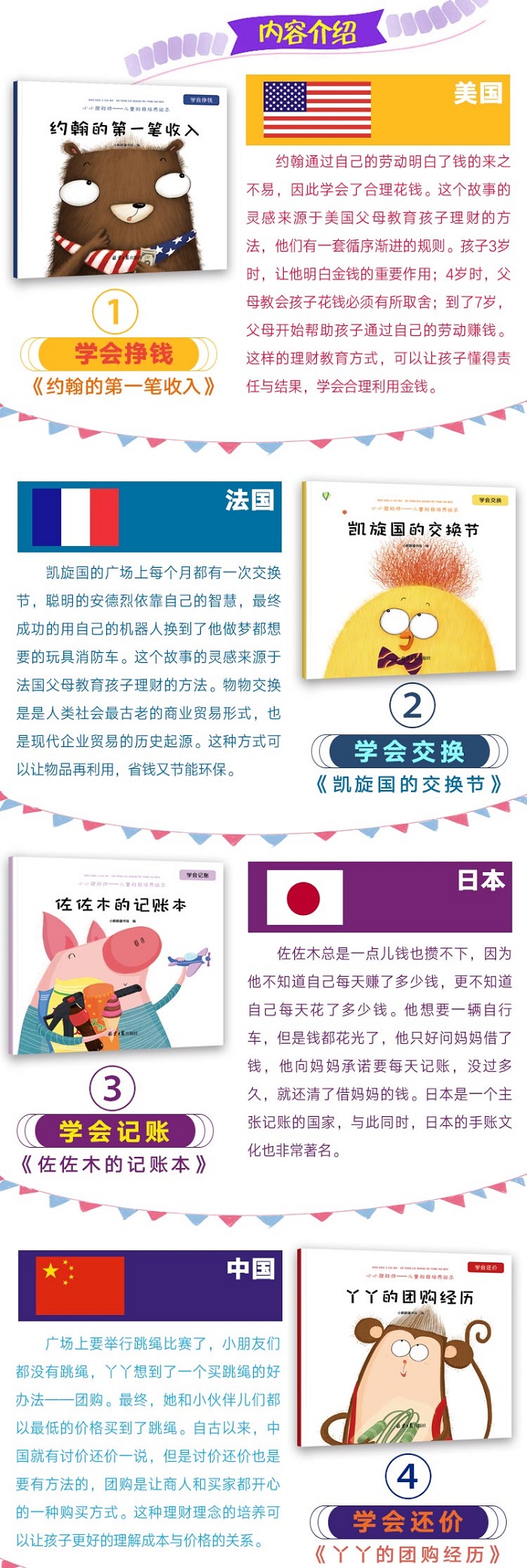 财商是一种认识金钱、管理金钱的能力。对儿童财商的培养有利于让孩子对金钱、对财富有积极的、正面的认识。一个孩子是否具有较高的财商,是否具有较好的理财习惯,这并非取决于先天的遗传,绝大多数需要后天培养。而每个国家在培养幼儿财商时各有侧重。本套绘本在研究了各个国家培养孩子财商的不同方式后,选取最为典型的八个国家,由资深绘本作者创作了八个有趣的故事,让家长和孩子在有趣的阅读中,潜移默化的学习到最先进的理财观念。