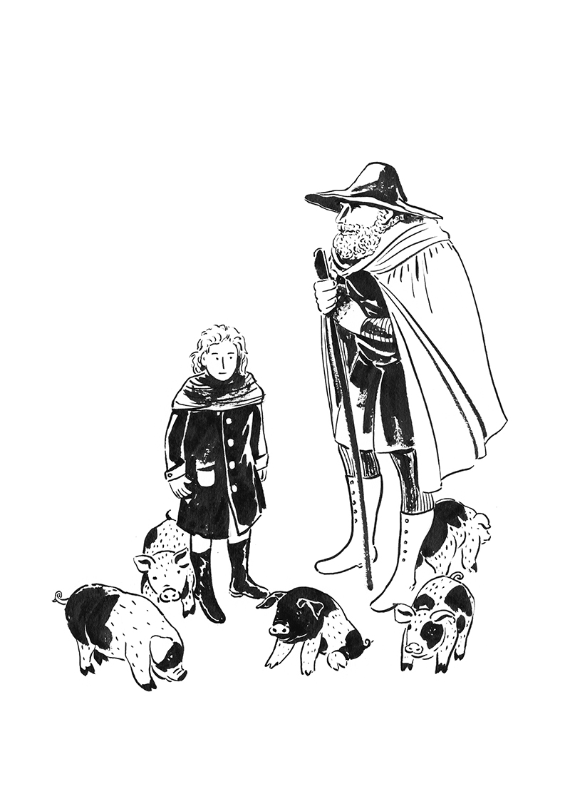 乔本该更警觉些的。毕竟爸爸过去常在他耳边念叨:“乔,你可以削木棍、捡浆果、吃东西,甚至抬头找老鹰,反正你总得做点什么。如果在山上啥都不做,只是干坐在早晨的太阳底下,听着四周叮叮作响的羊铃声,你肯定会睡着的。乔,你万万不可呆呆地看着同一个地方,只有当你的眼睛忙着四处张望的时候,才不会昏昏欲睡。另外,不管做什么,乔,千万别躺下。你可以坐下,但不能躺下。”这些乔统统都懂,但是那天早上,他五点半就起床了,又给一百只羊挤了奶,浑身疲惫。羊群在他跟前吃着牧草,一切似乎都很安宁。卢夫躺在他身边看守着羊群,脑袋枕着爪子一动不动,只有眼睛在转悠。