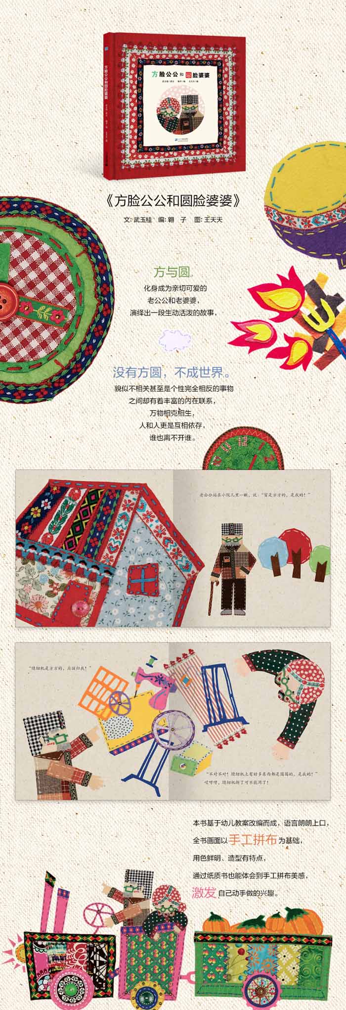 与传统的给学龄前孩子的认知绘本不同,《方脸公公和圆脸婆婆》基于一个幼儿教案改编而成,语言朗朗上口,全书画面更以手工拼布为基础,不仅用色鲜明、造型有特点,还让小读者通过纸质书也能体会到手工拼布美感,激发自己动手做的兴趣。