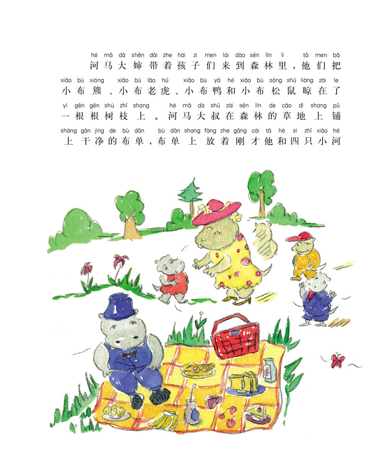 这时,有只小胖河马走过湖边,他看见小猪在湖里游泳,也就跳下了水。可是还没等他拉开架势游泳,小河马的爷爷老河马赶来了,赶快拖起小河马说:“这里有危险!”