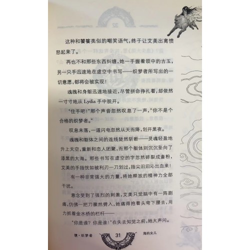 万千月儿迷翘首期盼的作品,一部沧月自己的梦之华衣。辟邪在饕餮的帮助下终于和织梦者(萧音)结为连理,过着幸福的生活。而饕餮(陶少泽)和新织梦者(艾美)为继承织梦者的责任,整日云游世界,增加自己的见识。突然有一天平静被打破,一个名叫“Lydia”的女孩在香艳迷离的酒会上,幽雅的跳楼自杀。更让人惊奇的是,艾美看到,无数深蓝头发的美人鱼(鲛人)在繁华喧闹的都市里,引领着死去“Lydia”的灵魂。而以为是妖邪迷惑众生的艾美,不惜用自己织梦者的的神力,来干预鲛人的引领。不想这一切,让原本平静的四人,再次卷入了一场海国复生的进程中,此间,荒诞、可笑、悲情、惊喜接连不断,神力无比的龙子饕餮,为牙痛看牙医,另外一个龙子辟邪竟然隐世当牙医,经历几万年重新诞生的龙神,认十七八九的艾美为“妈妈”,总之新奇尽在《镜·织梦者2:海的女儿》。