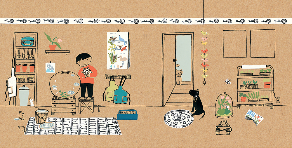 ●这本图画书画的是小男孩家的里面和外面,虽然时光流转、季节交替,小男孩穿的衣服四季不同,他种的蔬菜、花卉也在一天天变化,但地方还是这些地方。仔细观察一番后,你能说出哪一页跟哪一页画的是同一个地点吗?