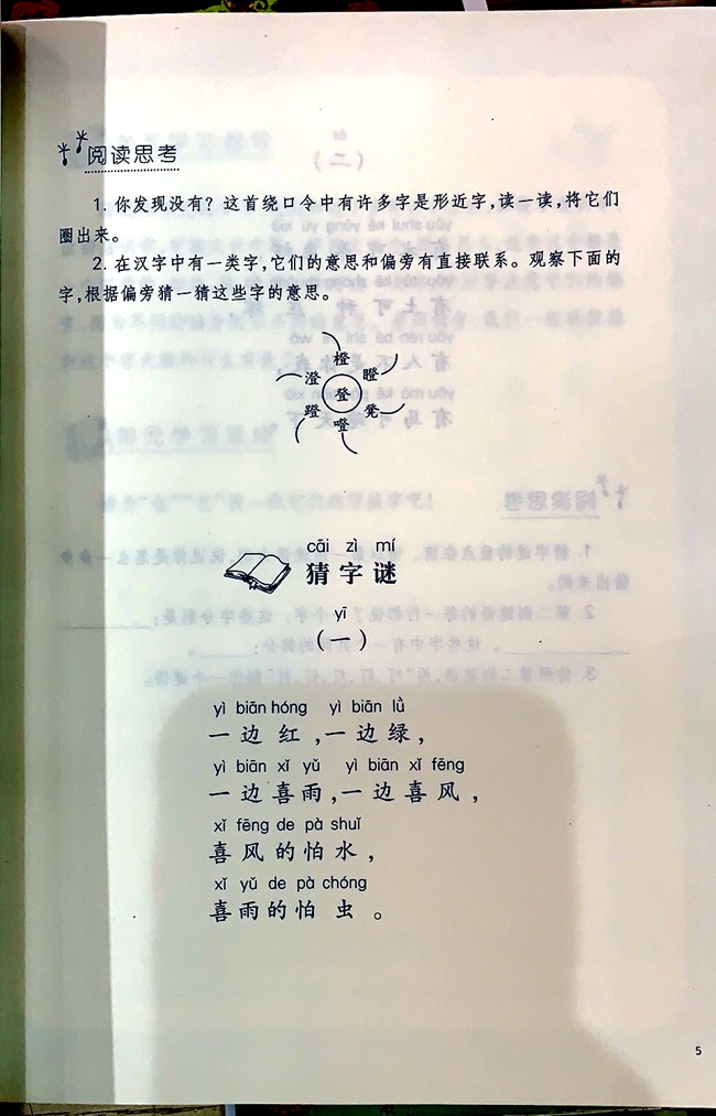 一年级下册基于儿童的精神发展和生命体验,从“人与自我”“人与社会”“人与自然”三大主题出发对教材的主题进行延展,涉及游戏、成长、动物、自然、神话故事等主题。选篇侧重轻松活泼童诗和儿童故事。如开学第一单元讲述百家姓氏,《百家姓》《猜字谜》;第二单元的讲述家乡风光,《山寨的早晨》;第六单元关注常见的动物,贴近生活,如《我家的小狗》《我家的小山羊》《我家的大肥猪》等。