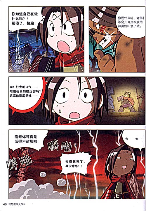 分母不同的分数怎么相加相减啊?学习分数乘除法吧!约分、约分,大家来约分啦!现在该轮到分数应用题上场啦!听说过《九章算术》吗?这可是中国古代的数学书哦。知修他们在地狱里奋勇杀敌,在乘法道长的大徒弟平方数战士——乔伊的帮助下,打败了地狱中的分数怪兽。为守护第三封印方程式封印,乘法道长对知修他们开始进行了紧急训练,真的是很辛苦哦