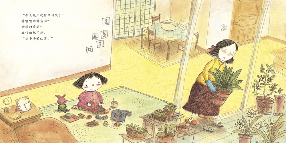 妈妈煮好了美味的红薯,小女孩急切地等着爸爸下班回家一起享用红薯。外面下起了雨,爸爸还没到家,小女孩和妈妈一起到车站接爸爸。故事体现家庭惯例和亲密关系的重要性,其中还有一个钟表作为时间贯穿,也是本书的另一个两点。