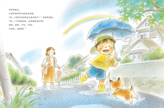 《爱上下雨天》:小佑很讨厌下雨天,因为到处都湿湿的。跟妈妈去超市的时候,小佑看见街上新开了一家“雨的商店”。店里的老奶奶会变出雾一样的雨、浇灌稻田的雨,还有打着闪电的雷阵雨。小佑这才发现,雨可以很漂亮,也可以很有用,他开始爱上下雨天了。