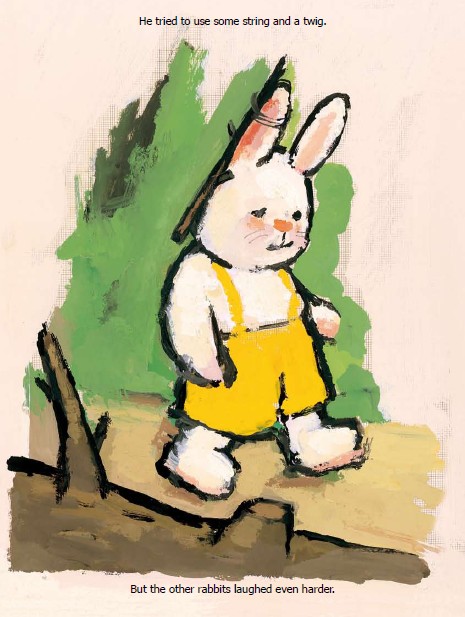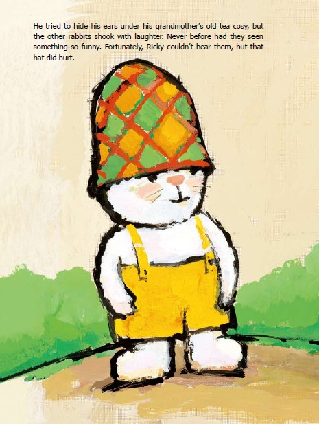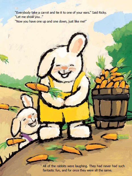 Ricky is different than the other rabbits because one of his ears hangs down. At first he tries to change his ear and be like the other rabbit. After trying many things he learns everyone is different and it's ok to be special.
