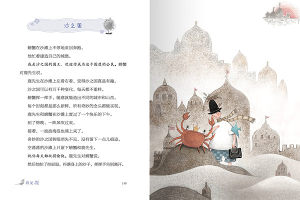 《看见鹿》收录了作者木也三部童话作品,包括《旅行的开始》《月亮的山谷》《迷路的星星》。故事的主角是一位戴着高高的帽子,提着小箱子的鹿先生,他有一只蓝色的小鸟在头上做巢。鹿先生出发了,他走进森林、经过山谷、穿越沙漠,看看天与地,无论黑夜与白天,一路上有各种神奇的相遇。比如:肚子发出一阵咕噜咕噜声,等待被喂饱的邮筒;渡渡鸟消失了,可它的影子留了下来;爱说大话,肚子快要胀破的青蛙;不看表的昆虫,他们的时间是花告诉他们的;每天张开大嘴,把大大小小的牙齿整齐摆放出来晒太阳的老鳄鱼……一个个简洁自然、奇异有趣又充满儿童思维的小童话串联起来,让读者感受到一种单纯的情绪:好奇、有趣还有爱。