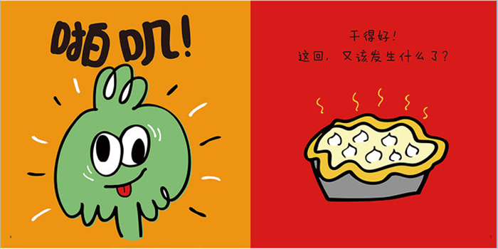 这是一套想象力爆棚、幽默好玩的互动绘本,包括《啪叽!》和《嗨,披萨!》两册。书中以孩子们喜欢吃的派、三明治、披萨等食物为主角,通过脑洞大开的互动情节、无拘无束的涂鸦画风和幽默逗趣的语言,来让孩子们主动沉浸在欢乐热闹的互动阅读中,从而激发他们的观察力、想象力和创造力。