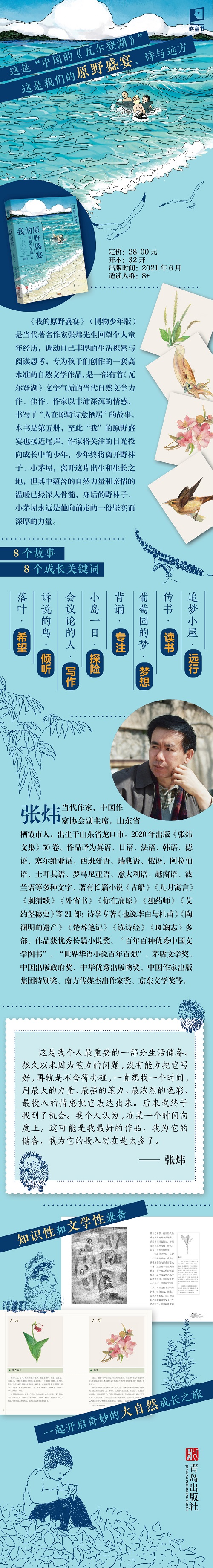 给孩子的“中国版《瓦尔登湖》”,的自然文学作品,在自然与文学的双重魅力中,提升孩子的自然感知力,感知涌动的生命力,感知神奇的自然万物,感知豁达的心性,感知生命的来处和去处。 给孩子的带有寓言与哲思气质的成长故事。这本书是《我的原野盛宴》的后一本,主人公带着大自然给予的精神滋养和梦想的种子,开始将视线放在生活的“别处”,这仿佛是自然成长结束的地方,也是成长开始的地方。 现代汉语写作范本,在颇具神秘感的有趣故事中,将写作之法传授给孩子。在书中,作文就像是从心灵深处流淌出来的,那么的自然,那么的神奇,那么的富含诗意。这才是真正的表达,这才是孩子们应该学习的作文之法。 知识性和文学性兼备,精美彩图,配以精心编辑整理的科普知识、民间传说、诗词典故等等,具有通识教育的魅力。 《我的原野盛宴》是当代著名作家张炜先生创作的一套自然文学作品,是一部有着《瓦尔登湖》文学气质的当代自然文学力作、佳作。本书是第五册,作家将关注的目光投向成长中的少年,离开野林子、小茅屋之后,少年也离开了童年那段萦绕着丰富美好记忆的独特时光,但是其中蕴含的自然力量和亲情的温暖已经深入骨髓,身后的野林子、小茅屋永远是他向前走的一份坚实而深厚的力量。