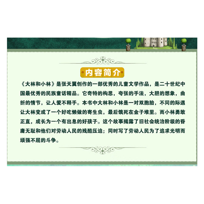 本书是张天翼的一本经典儿童文学童话集,主要讲一对兄弟截然不同的人生际遇。哥哥大林机缘巧合成为富翁的儿子,却在腐化生活的侵蚀下渐渐失去生活的能力,最后饿死在只有一堆财宝的孤岛上;弟弟小林虽然开始就遭遇坏人,但在不断地努力下终于和伙伴逃脱魔掌,成为一名火车司机。故事的语言夸张幽默,各个人物形象夸张却生动形象,从侧面描绘了民国时期社会上层的腐化豪奢及人民大众的困苦生活,读后发人深思。
