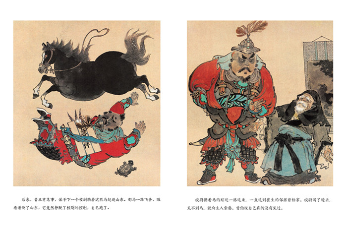 《画马》:改写自清代蒲松龄《聊斋志异》中的一篇故事。讲述的是一匹神马从画中活了过来,帮助一名落魄的书生谋取了不错的生计,却给画主人带来灾祸,最后蒙在鼓里的画主人被知恩图报的书生搭救的故事。由著名儿童阅读推广人、图画书研究者阿甲改写;由蜚声海内外的著名中国画画家戴敦邦绘画。