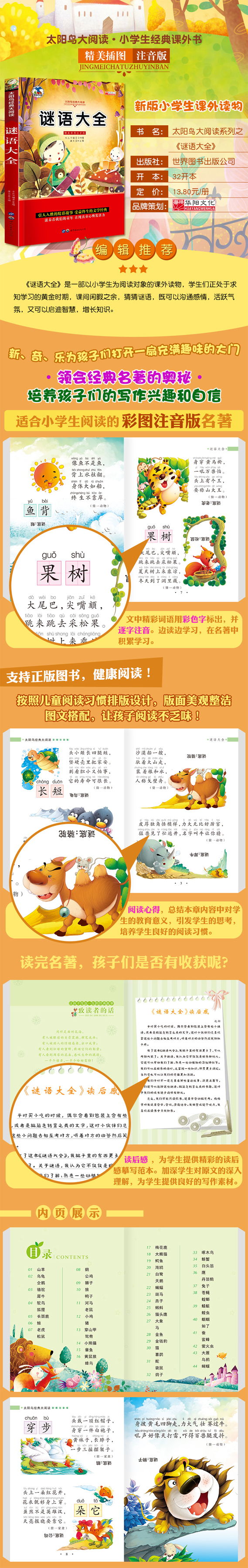 《谜语大全》是一部以小学生为阅读对象的课外读物,学生们正处于求 知学习的黄金时期,课间闲暇之余,猜猜谜语,既可以沟通感情,活跃气 氛,又可以启迪智慧,增长知识。