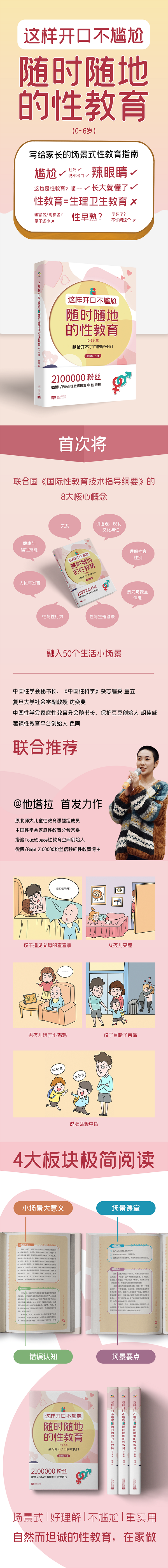 《这样开口不尴尬——随时随地的性教育(0-6岁篇)》210万粉丝性教育博主他塔拉,将全面性教育的核心理念融入50个生活场景,针对0-6岁孩子常见的夹腿、玩弄小鸡鸡等行为,以及健康亲密关系的构建、学习生理知识、预防性伤害等内容,指导家长科学合理地开展与孩子认知水平相适应的家庭性教育。