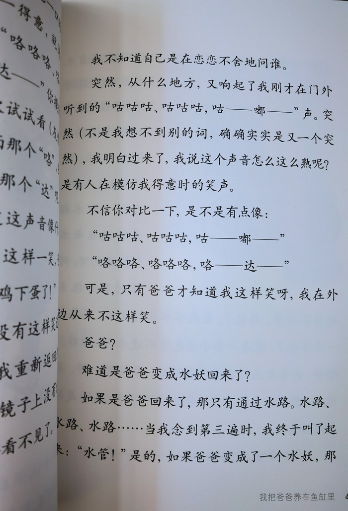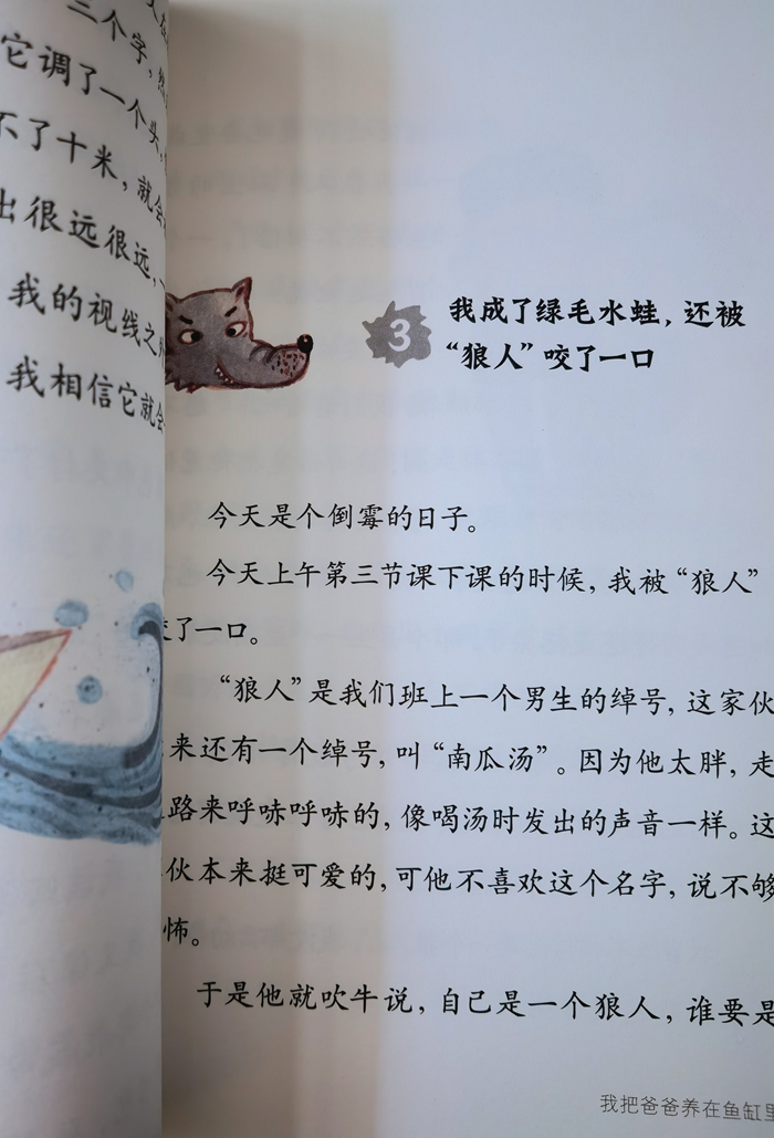 我叫水娃。 我上二年级,还有一个多星期,我们就放暑假了。 水娃不是我的大名,我的大名叫什么?嗯,嗯嗯,我不告诉你们行吗?请允许我保守这个秘密,我不想让人知道我就是这个奇幻故事的主人公。 水娃是我的小名,是我爸爸给我起的。 我爸爸说,我天生就会游泳,天生就是一个水孩子。 不骗你,我爸爸说在我还是一个婴儿的时候,他就做过一次试验了。 我还没满月,在一个月黑风高(我近说话、写作文的时候,特别喜欢用这个词,又恐怖又吓人,不信你读读,看看会不会起一身鸡皮疙瘩)的夜晚,趁我妈妈睡着了,他抱起我一闪身,就溜出了家门。我们家后面有一个水塘,爸爸说他刚把我放进水里,奇迹就发生了!在这个月黑风高(请原谅我,我实在是离不开这个词了)的夜晚,我,一个才出生不到三十天的男婴,一沾水,竟然像在水里出生的小蝌蚪一样,小腿一蹬,就一个人游了起来,而且游得比蝌蚪还要快! 可是当我游到水塘中央的时候,突然不对头了,站在岸上的爸爸发现,我被一股水流给卷走了,直朝闸门的方向冲去!原来,这个月黑风高(这样的夜晚,总是会有可怕的事情发生)的夜晚,水塘和大河之间的那道闸门不知被什么人给打开了。爸爸尖叫了一声,跳进水里,朝我游了过来,可是已经来不及了,我就要冲过闸门,冲进水塘外边的那条浊浪滔天的大河里了!就在这时,有什么东西从河那边冲了进来,在闸门口把我接住了。一个人?不是。一条大鲸鱼?不是。一只成了精的巨蟹?也不是。说了你也许不会相信,是一个水妖,一个绿色的水妖! 水妖? 我们这个世界有水妖? 你不用瞪眼睛,我知道你不相信,可是我告诉你,在这个月黑风高(这是我后一次使用这个词了)的夜晚,确实是一个绿色的水妖救了我的命。