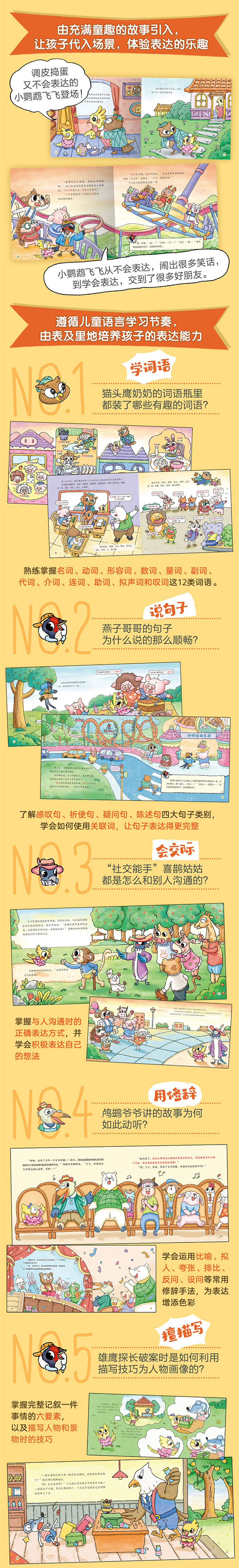 ·读故事,学表达:由充满童趣的故事引入,让孩子代入场景,体验表达的乐趣 ·遵循儿童语言学习节奏, 由表及里地培养孩子的表达能力。 NO.1 学词语:熟练掌握名词、动词、形容词、数词、量词、副词、代词、介词、连词、助词、拟声词和叹词这12类词语的应用。 NO.2 说句子: 了解感叹句、祈使句、疑问句、陈述句四大句子类别,学会如何使用关联词,让句子表达更加完整。 NO.3 懂社交:掌握与人沟通时的正确表达方式,并学会积极表达自己的想法。 NO.4 用修辞:学会运用比喻、拟人、夸张、排比、反问、设问等常用修辞手法,为语言表达增添色彩。 NO.5 擅描写:掌握完整记叙一件事情的六要素,以及描写人物及景物时的五感,既要会说,又要会写! ·搭配游戏闯关练习,寓教于乐,全面提升儿童的综合表达水平! ·抓住儿童语言发展关键期,让孩子学会表达、用于表达、爱上表达!开启自信人生!