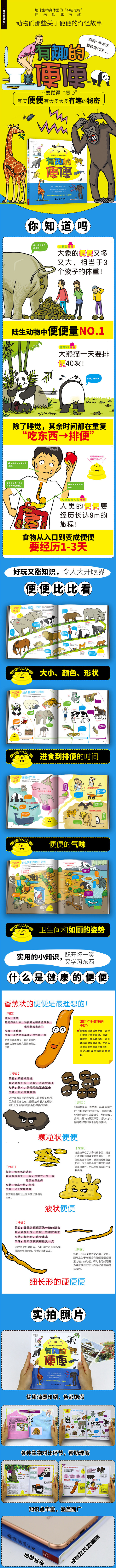 1、关于便便,这里讲出了很多颠覆我们认知的小知识,地球上所有生物身体里的“神秘之物”原来如此有趣; 2、适合亲子共读,一个个有趣的便便小故事,大人和孩子都会忍不住想要一直看下去; 3、可爱的插画 通俗的解说,不可多得的解压读物。