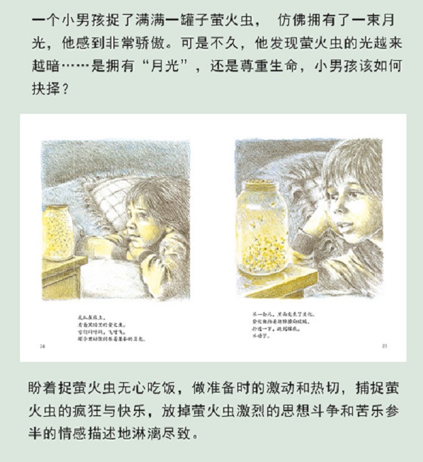 盼着捉萤火虫无心吃饭,做准备时的激动和热切,捕捉萤火虫的疯狂与快乐,放掉萤火虫激烈的思想斗争和苦乐参半的情感描述地淋漓尽致。