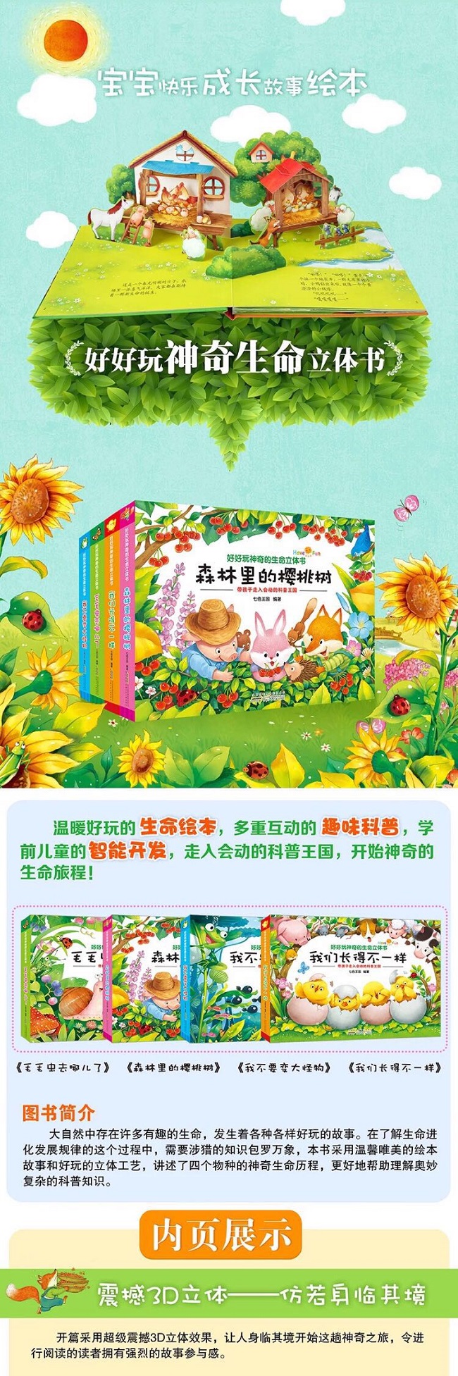 “好好玩神奇的生命立体书”共4册,分别是《我们长得不一样》《森林里的樱桃树》《毛毛虫去哪儿了》《我不要变大怪物》。大自然里有许多神奇的生命,每天都发生各种各样好玩的故事。作品通过主角们成长过程中的奇妙过程,揭露了大自然中生命发展的自然规律。温暖动人的文字,优美细腻的图画,系统的科普知识,再加上精巧独到的工艺,带孩子走入会动的科普王国。